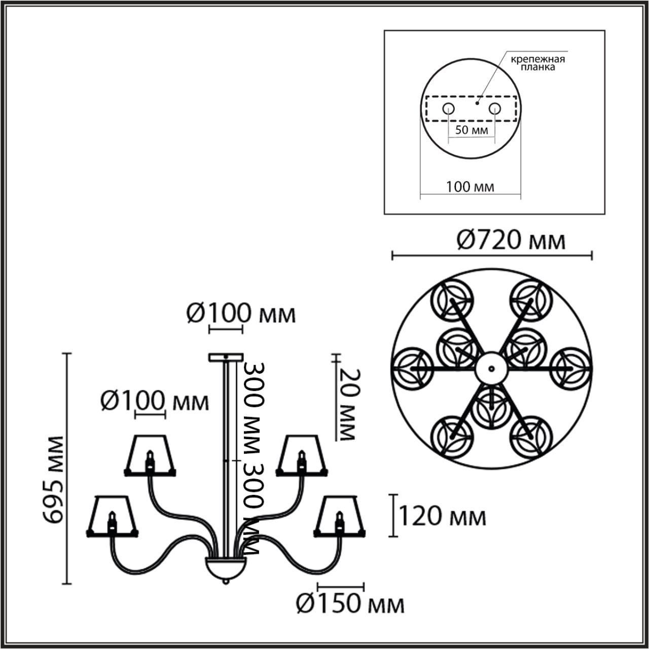 Пять роскошных плафонов-абажуров сделаны из прочного матового стекла, оформлены растительным прозрачным орнаментом, делающим ее воздушной, легкой, словно парящей в воздухе.