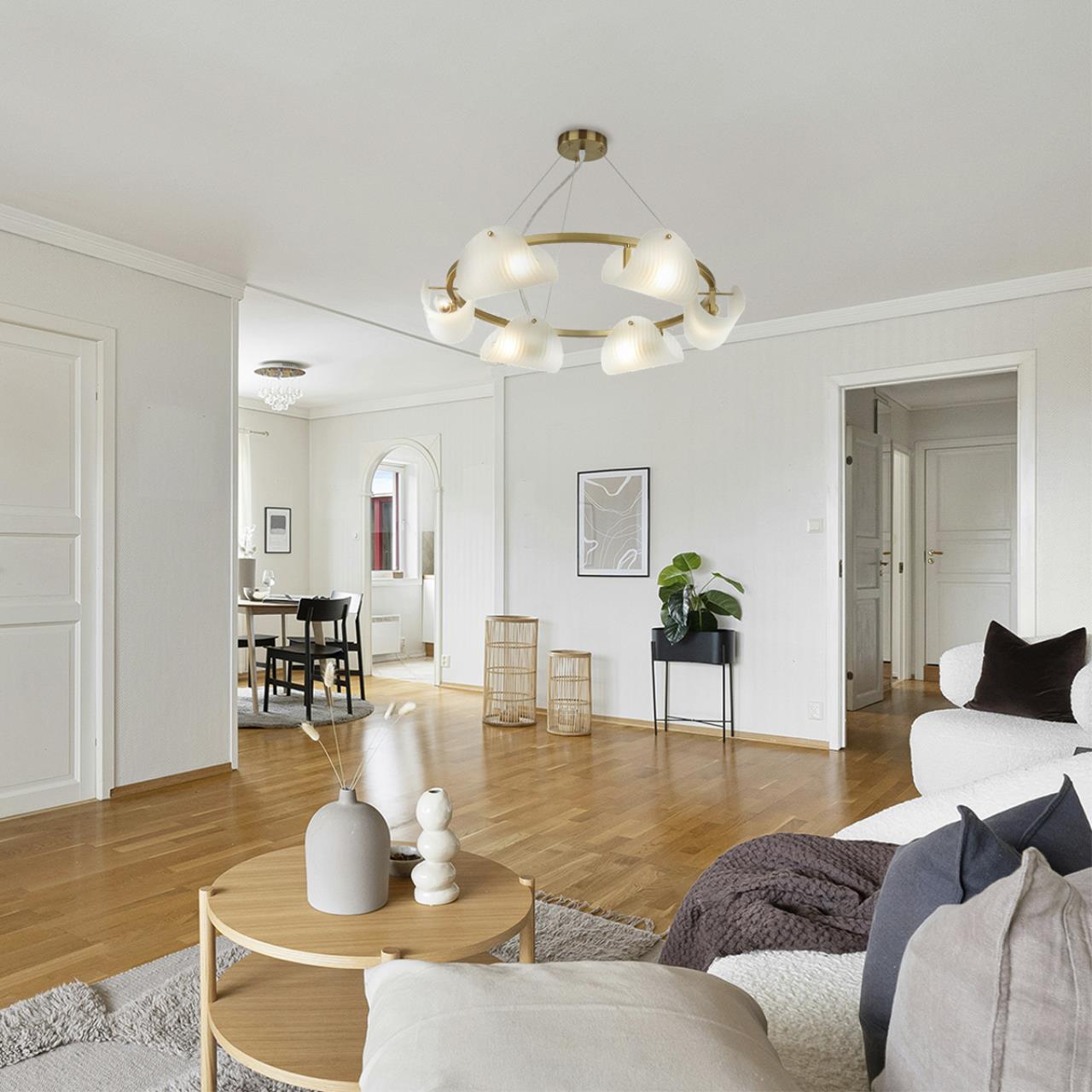 Такая бесподобная люстра в форме больших, красивых лепестков, на которых отчетливо видна даже естественная фактура, мгновенно погружает в атмосферу убаюкивающего релакса и дает возможность быстро расслабиться после напряженного дня.
