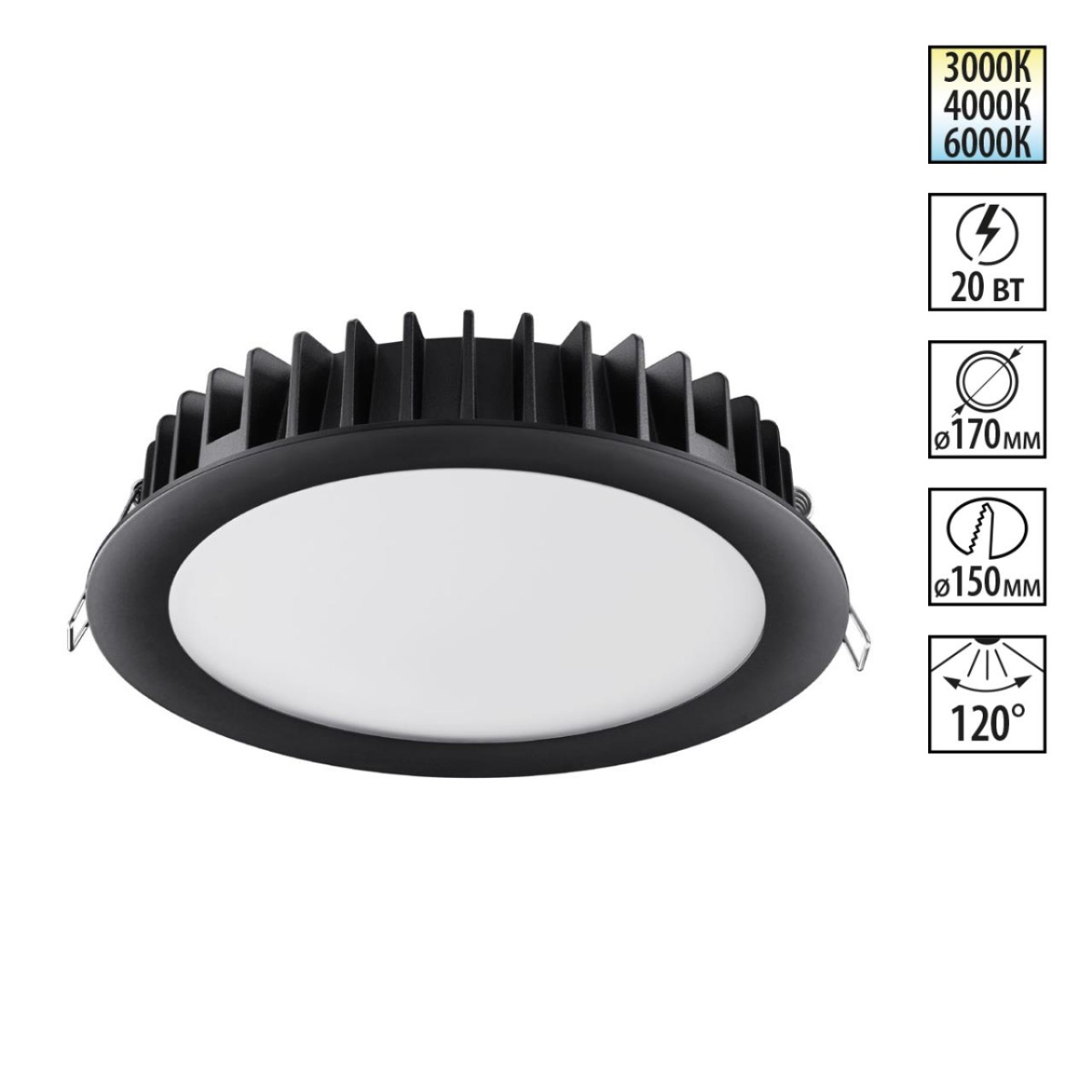 NOVOTECH 358954 SPOT NT22 444 черный Встраиваемый светодиодный светильник с переключателем цветовой температуры IP20 LED 3000К\4000К\6000К 20W 220V LANTE – купить в Москве по цене 1 800 руб.