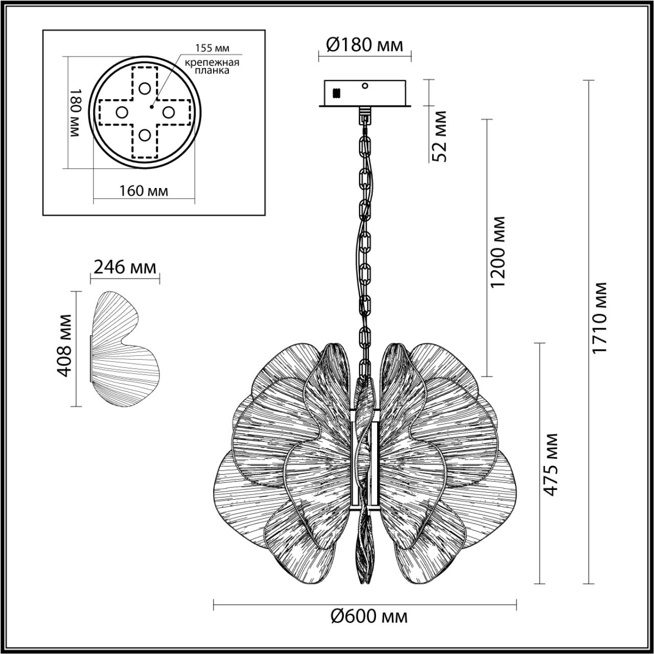 Пять роскошных плафонов-абажуров сделаны из прочного матового стекла, оформлены растительным прозрачным орнаментом, делающим ее воздушной, легкой, словно парящей в воздухе.