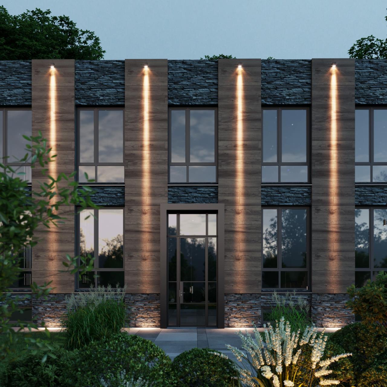 Фасадные светильники ARROW с углом рассеивания 8° со светодиодами COB EPISTAR дают длинный ровный луч до 7-8 метров в одну сторону. Могут эксплуатироваться в диапазоне температур -40° + 50°. В светильниках используется высококачественное стекло для равномерного и четкого рассеивания. Длина луча достигается не за счет количества люменов, а за счет конусовидной TIR линзы (TOTAL INTERNAL REFLECTION), использующей принцип отражения света от внутренних стенок. В этом случае линза является ещё и отражателем, в связи с чем имеет особую форму.