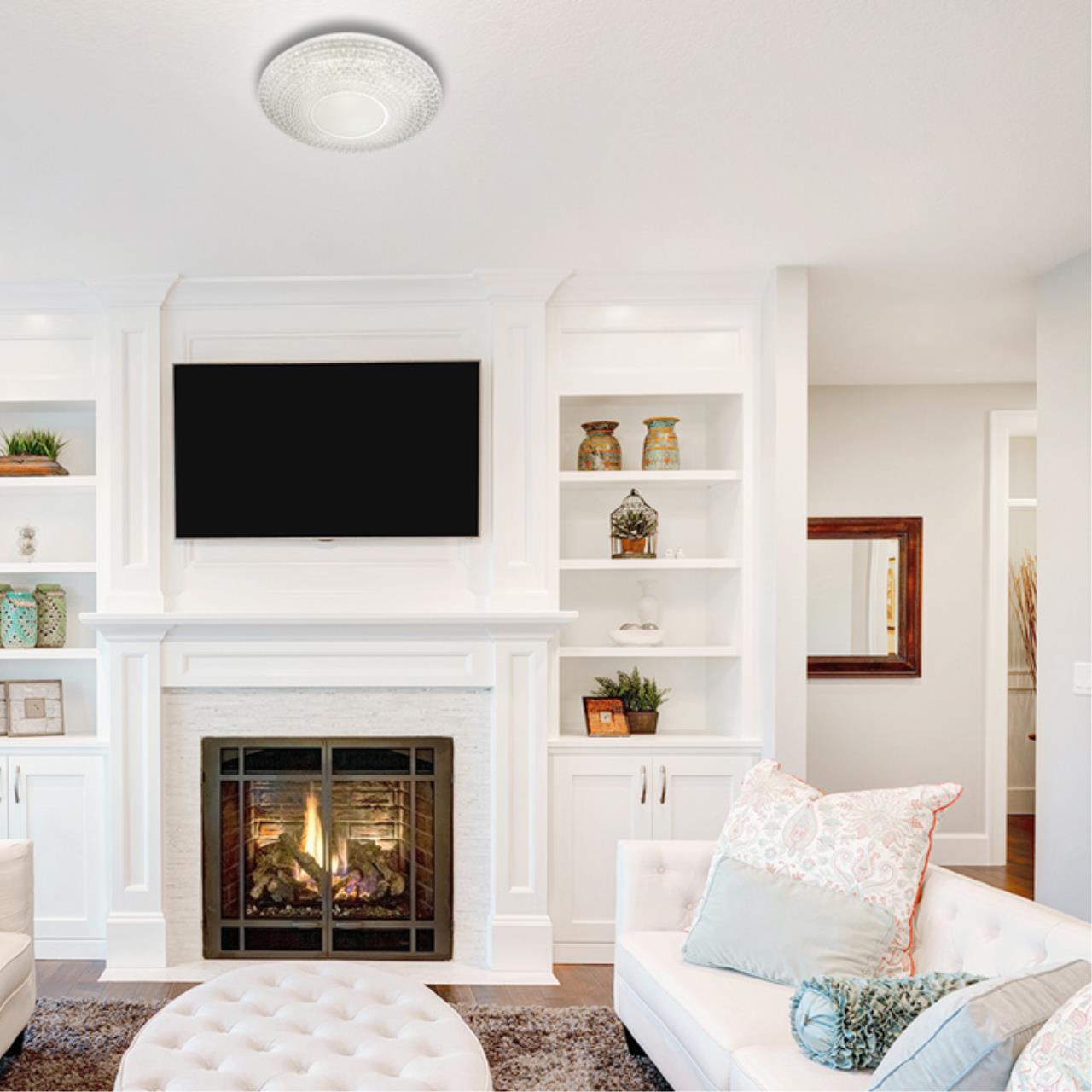 Светильник 2048//EL линии VISMA состоит из металлического основания (базы) и пластикового рассеивателя. Материал рассеивателя - высококачественный акрил, обеспечивающий светильнику равномерное рассеивание и хорошее светопропускание. Форма плафона: круглая, декорирована центральной вставкой с кантом цвета хром и рельефной структурой "под хрусталь", которая придает включенному светильнику красивый эффект переливания. Степень защиты IP43 позволяет использовать светильник в определенных зонах влажных помещений. В комплект входит заменяемый LED модуль с линзами, мощностью 72Вт, которая соответствует лампе накаливания 730Вт. А также пульт ДУ, с помощью которого осуществляется плавное изменение цветовой температуры 3000-6300К, изменение яркости, переход в режим переключения теплого/белого/холодного/ночного света. Светильник имеет функцию "память".