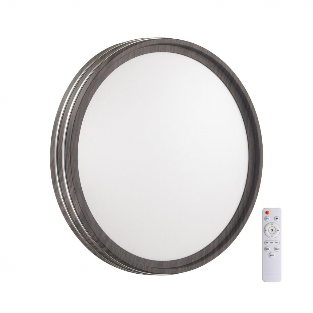 Светильник 7604/EL линии TROSTO состоит из металлического основания (базы) и пластикового рассеивателя. Материал рассеивателя — высококачественный пластик марки PMMA 2.0 белого цвета с матовой поверхностью без текстуры. Пластик обеспечивает светильнику равномерное рассеивание и хорошее светопропускание. Форма плафона: круглая, декорирована ободом из пластика темно-коричневого цвета под дерево и кантом цвета хром. Степень защиты IP43 позволяет использовать светильник в определенных зонах влажных помещений. В комплект входит заменяемый LED-модуль с линзами мощностью 72 Вт, соответствующей лампе накаливания 730 Вт, а также пульт ДУ, с помощью которого осуществляется плавное изменение цветовой температуры в диапазоне 3000—6300 К, изменение яркости, переход в режим переключения теплого/белого/холодного/ночного света. Светильник имеет функцию памяти.