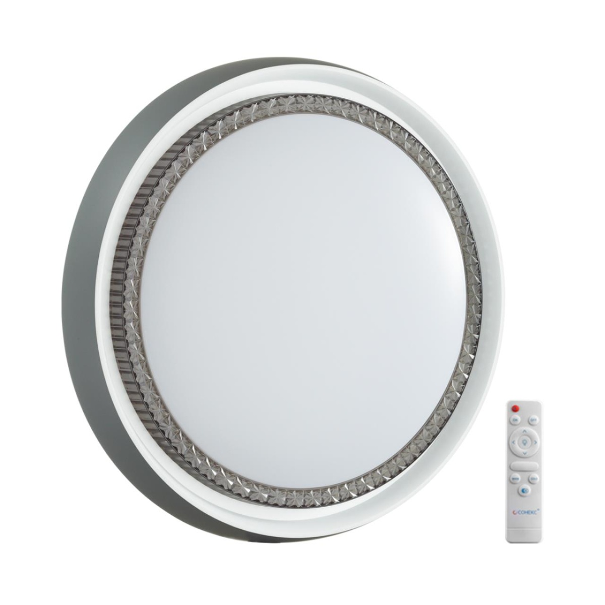 Светильник 7644/DL линии RAHIG состоит из металлического основания (базы) и пластикового рассеивателя. Материал рассеивателя — высококачественный пластик марки PMMA 2.0 белого цвета с матовой поверхностью. Пластик обеспечивает светильнику равномерное рассеивание и хорошее светопропускание. Материал обода — пластик серого цвета с внешней стороны, белого цвета с внутренней стороны.Форма плафона: круглая, декорирована вставкой под хрусталь из прозрачного пластика дымчатого цвета. Степень защиты IP43 позволяет использовать светильник в определенных зонах влажных помещений. В комплект входит заменяемый LED-модуль с линзами мощностью 70 Вт, соответствующей лампе накаливания 610 Вт, также пульт ДУ (с креплением на стену), с помощью которого осуществляется плавное изменение цветовой температуры в диапазоне 3000—6000 К, изменение яркости, переход в режим переключения теплого/белого/холодного/ночного света. Светильник имеет функцию памяти.