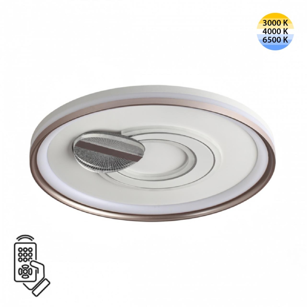 Светильники GEMINI имеют несколько контуров освещения, которые создают красивый декоративный эффект. В центре находится декоративный объемный элемент в виде круга из акрила с глиттером внутри, который добавляет светильнику декоративной привлекательности. Светильник оснащен пультом ДУ.